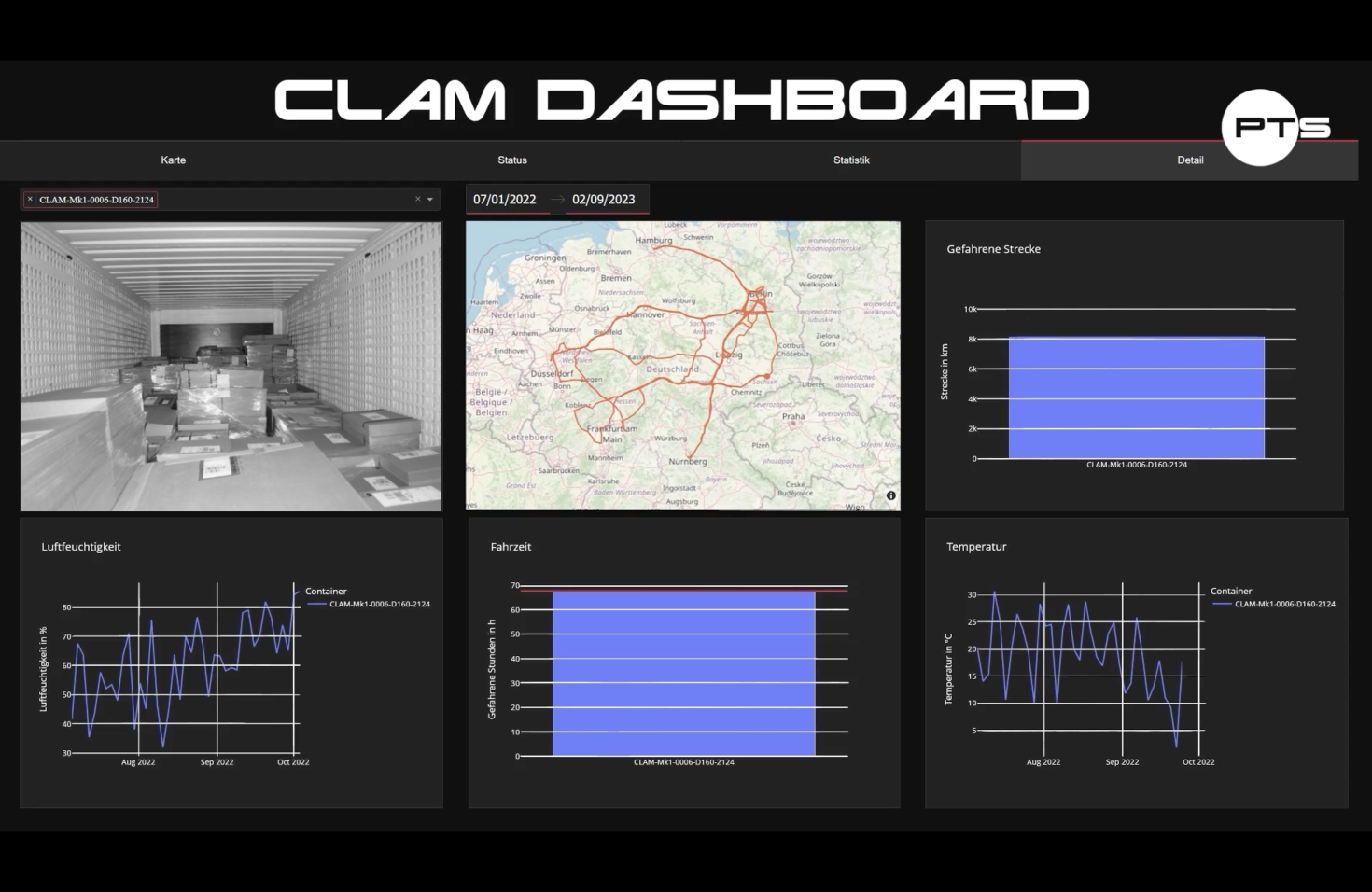 Das CLAM-Dashboard bietet eine umfassende Übersicht über die von den Sensoren gesammelten Daten. Kunden können die Daten nach bestimmten Zeitspannen, Containern oder Depots filtern und eine Übersicht über die Standorte der Container sowie die zurückgelegten Entfernungen auf einer Karte visualisieren. Daten werden in Tabellen und Diagrammen präsentiert, um eine schnelle Analyse zu ermöglichen. Das Dashboard ist an die spezifischen Anforderungen des Kunden anpassbar und ermöglicht ein intuitives Tracking von Wechselbehältern und Containern, individuell angepasst an die Bedürfnisse des Kunden.